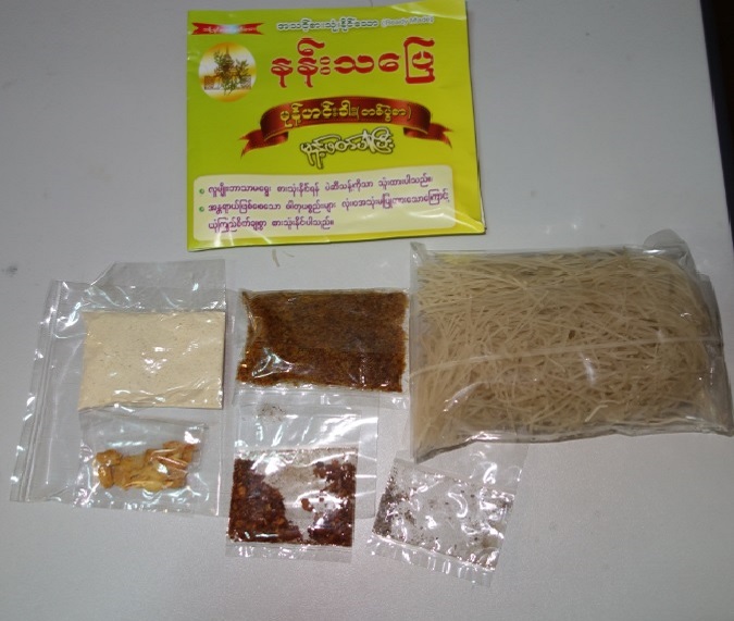 前回はシャンヌードル即席麺のHANAを紹介したが、今回はミャンマー(ビルマ)の麺料理で一番有名である『モヒンガー』の即席麺を紹介することにする。これは麺とスープなどがセットになったもので、麺は普通にミャンマーの家庭で使われる乾燥麺が一人前分入っており、魚ペースト等を使わなくても即席で出来るスープで簡単に出来る様になっている。